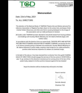 The Theatre Arts and Motion Pictures Practitioners Association of Nigeria (TAMPAN), has suspended actors Nkechi Blessing Sunday and Kehinde Adams aka Lege.