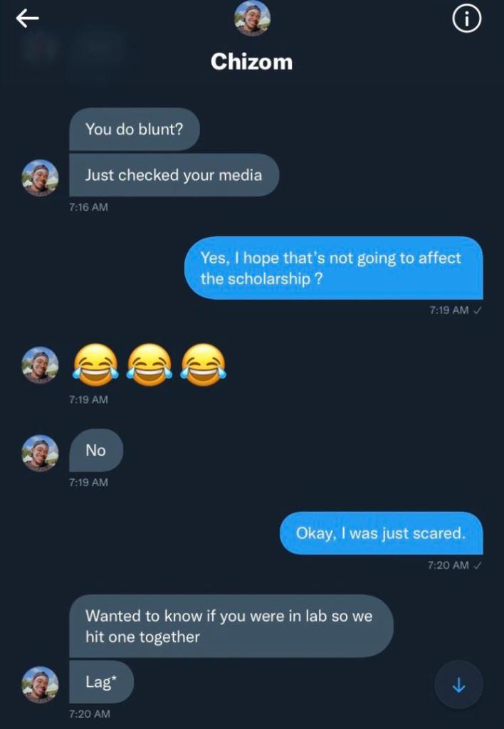 Odele published private chats between married Chizom and the said lady. In one of the chats, Chisom asked the lady if she was into ‘blunt’ (weed) and she responded in the affirmative, prompting Chisom to become bolder, suggesting that he would arrange a location where the two of them could meet.